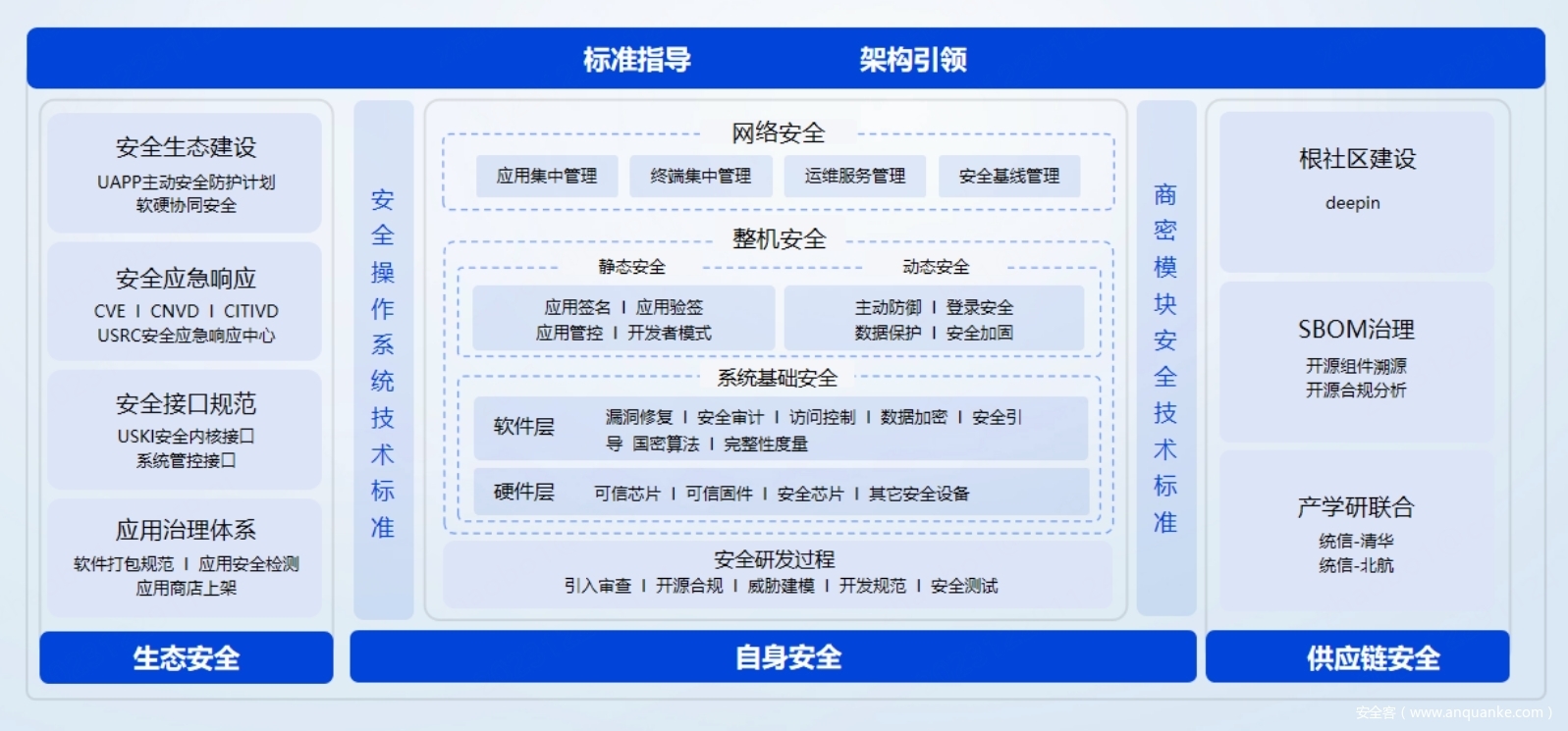 统信软件从成立之初,就将“安全”放在首位,是国内首家通过GB/T 20272-2019安全操作系统四级认证、商用密码产品二级认证的OS厂商。从打造操作系统根社区,到深度共建国际知名开源社区,再到完善的开源产品、商业产品矩阵,各个层面都有关键自研技术,每一层之间都有大量反馈。统信软件具备高标准指导和全架构引领,基于分层分类理论,从自身安全、生态安全和供应链安全多维度打造和提升全栈安全能力。