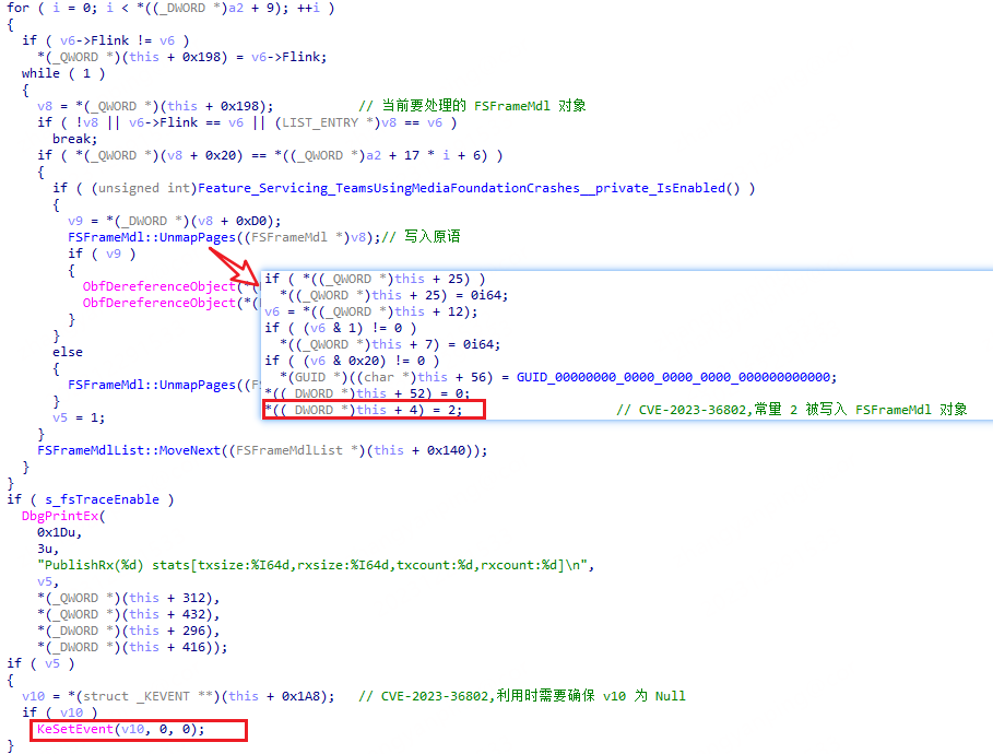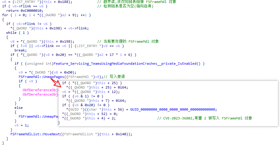 一是任意地址写入常量 2,在 FSStreamReg::PublishRx 函数中其遍历 FSStreamReg 对象 0x140 处的 FSFrameMdlList 链表中的 FSFrameMdl 对象,并将 FSFrameMdl 对象中的 MDL 取消映射,现在通过 Fake FSStreamReg(FSContextReg) 对象 0x140 处的 FSFrameMdlList 链表中链接的 FSFrameMdl 对象的地址可以实现任意地址写入常量2。