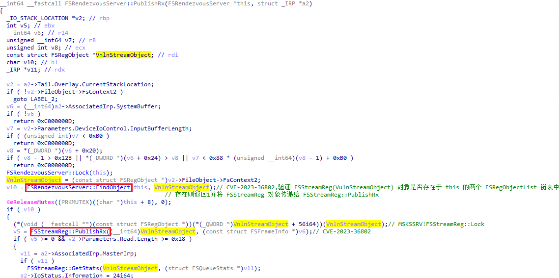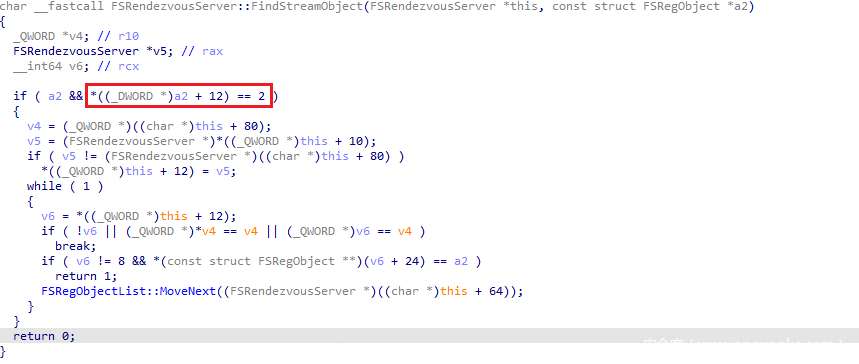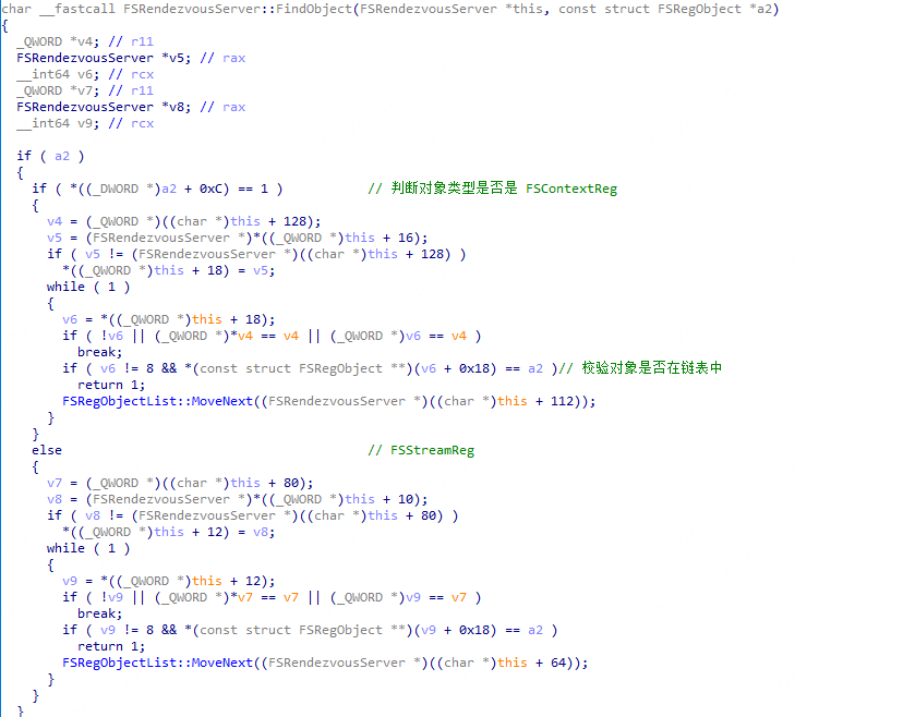 补丁后 FSRendezvousServer::FindObject 函数变为 FSRendezvousServer::FindStreamObject 函数,其只检查 FSStreamReg 对象是否在 FSRendezvousServer 对象 0x40 处的 FSRegObjectList 链表中。