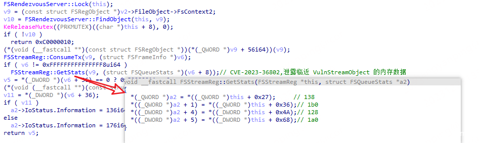 二是信息泄露,FSRendezvousServer::ConsumeTx->FSStreamReg::GetStats 函数将 Fake FSStreamReg 对象中的部分数据写入 SystemBuffer,可以通过检测特征数据来判断内存布局。