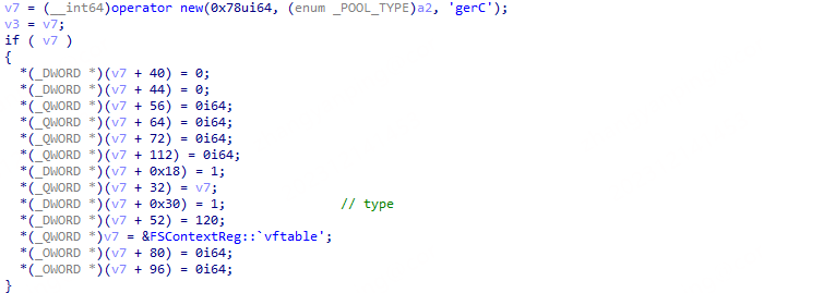 FSContextReg 对象的创建由 FSRendezvousServer::InitializeContext 函数完成,创建时对象类型字段被赋值为 1,FSContextReg 对象被创建之前会先创建 FSRendezvousServer 对象。