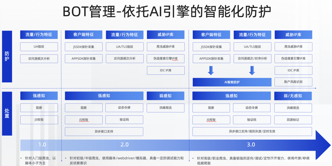 阿里云WAF的BOT管理能力支持网页/H5(自动集成SDK)和原生APP(手工集成SDK)两类场景,通过SDK,客户端将上报浏览器或者APP所处的环境信息,进一步结合访问时序的分析,AI智能防护模块将自动化刻画攻击者ID,跟踪其访问行为,自主学习,发现隐匿的攻击流量,做出更加智能的决策,提升爬虫的检测率,降低用户的配置维护成本。
