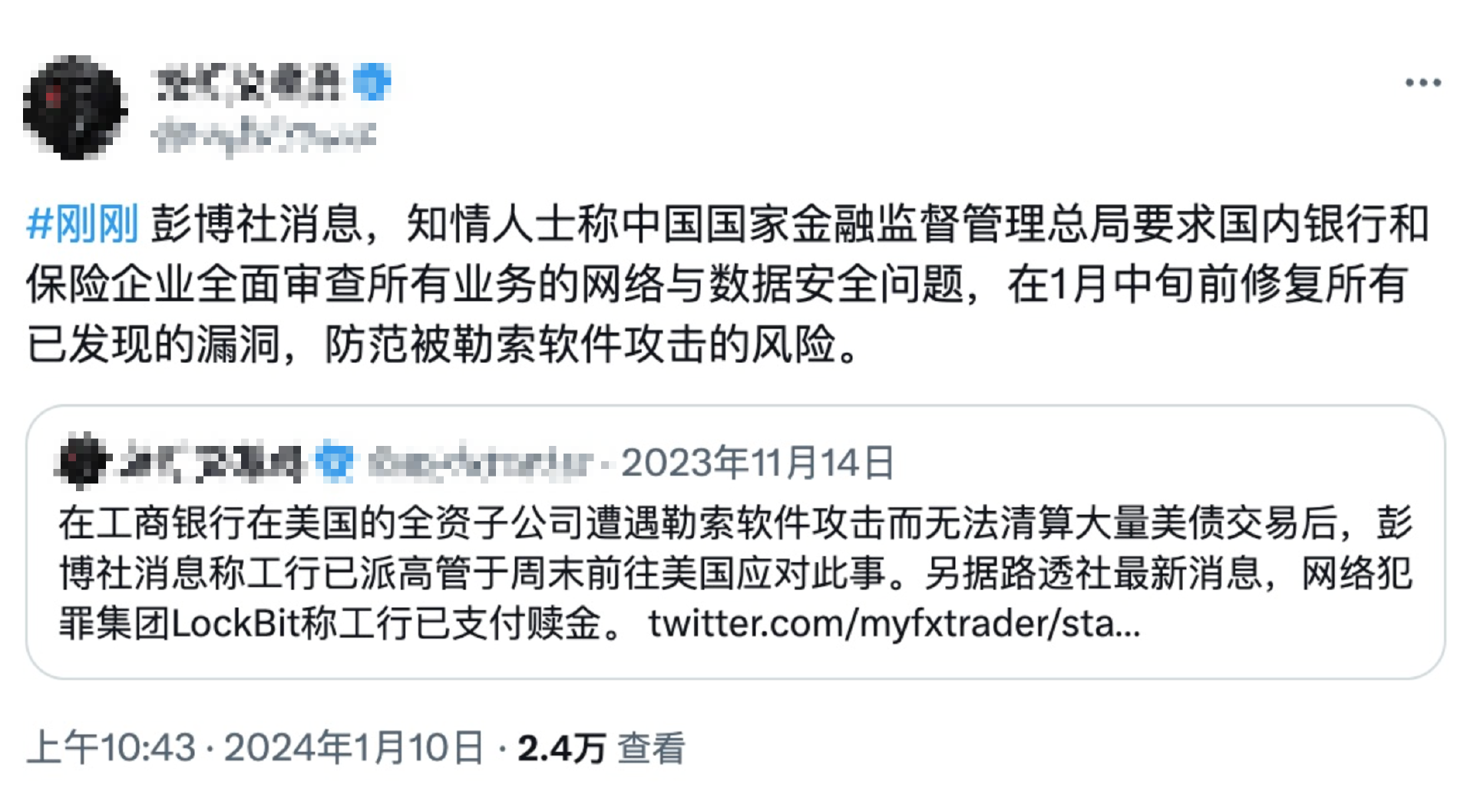 2023 年 11 月,工商银行在美全资子公司工银金融服务有限责任公司遭到勒索软件攻击,导致部分系统中断,引起了业内的广泛关注与讨论。