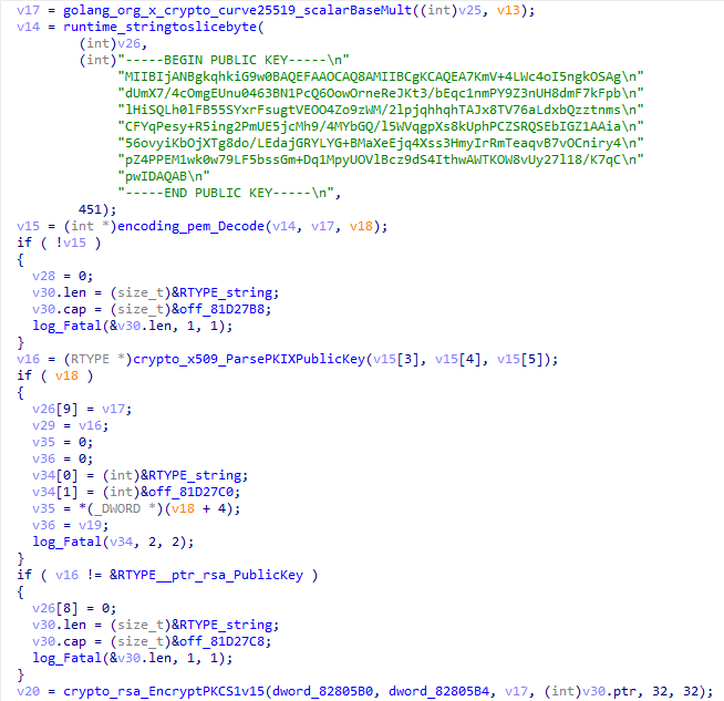 LvtLocker属于Babuk勒索软件的变种。与目前主流的其它勒索软件家族类似,LvtLocker勒索软件同样是在代码中,内置了一套用于加密数据的RSA公钥(与之对应用于解密的私钥则在作者手中)。在软件开始运行后,会在受害者机器中利用ECC算法生成一对密钥,并利用这套内置的RSA公钥对本地生成的ECC私钥进行加密。