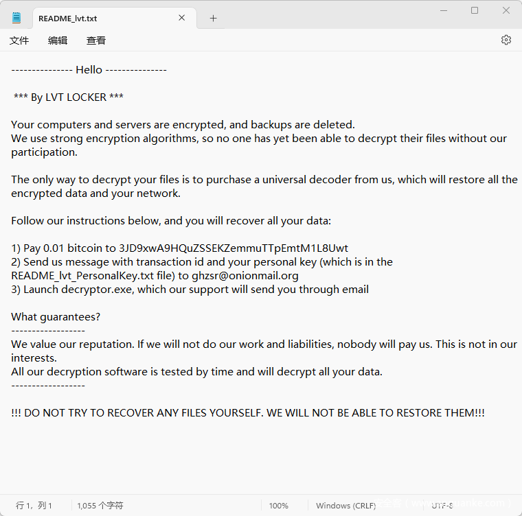 此外,勒索软件会释放勒索信文件README_lvt.txt与受害者识别id文件README_lvt_PersonalKey.txt。这两个文件的内容完全一致。