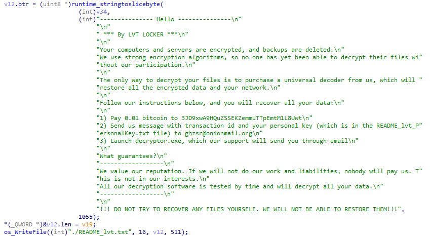 根据捕获到的勒索软件样本看,当前版本的LvtLocker索要的赎金金额为0.01个比特币(当前价格约为3700元人民币)。