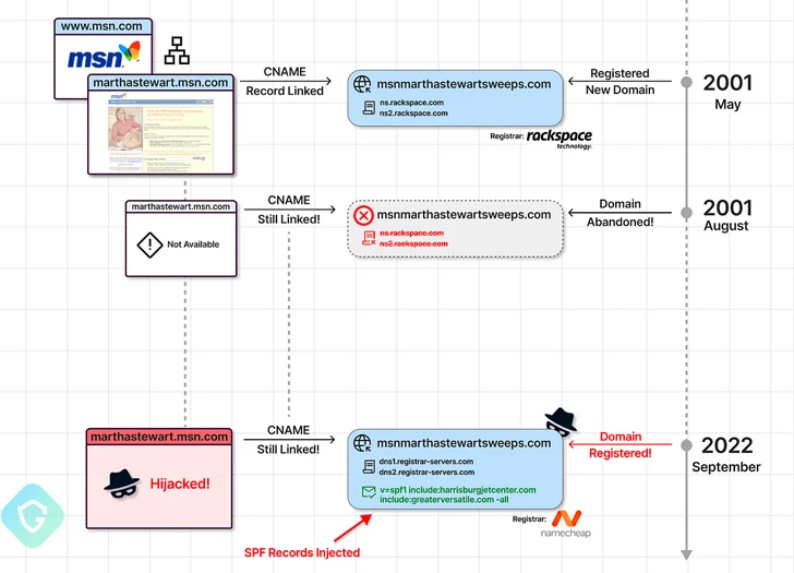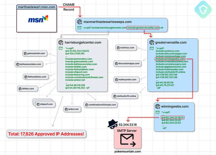 研究人员表示:“这意味着该子域继承了 msnmarthastewartsweeps[.]com 的全部行为,包括其 SPF 策略。” “在这种情况下,演员可以向他们想要的任何人发送电子邮件,就像 msn[.]com 及其批准的邮件发送者发送这些电子邮件一样!”