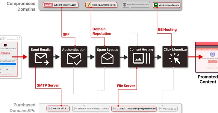 研究人员表示:“这一操作经过精心设计,旨在滥用这些资产来分发各种恶意‘广告’,旨在为这些‘广告网络’客户产生尽可能多的点击量。”