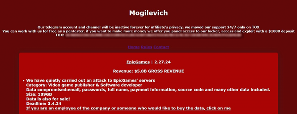 Mogilevich 官方尚未给出数据的具体赎金金额,Epic Games 支付或其他人购买信息的截止日期定为 3 月 4 日。值得注意的是,与之前的一些网络攻击案例不同,该组织没有提供任何黑客攻击的证据。