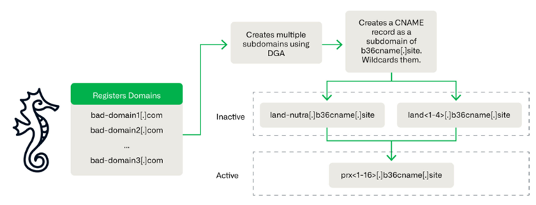 Savvy Seahorse 使用域名生成算法 (DGA) 在 CNAME TDS 系统中创建和管理数千个域名。此类域可以将其状态从“停放”更改为“测试中”和“活动活动”,这使得其基础设施难以跟踪和映射。