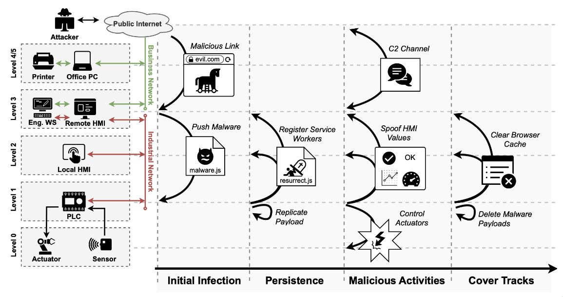 为了实现持久性,这种新型 PLC 恶意软件利用服务工作线程,允许 JavaScript 代码深入浏览器缓存并独立于安装它的网页执行。此外,文件从服务器删除后,它们将继续运行长达 24 小时。使用这种方法,恶意软件可以在固件更新、新的基于网络的 HMI 甚至硬件更换中幸存。