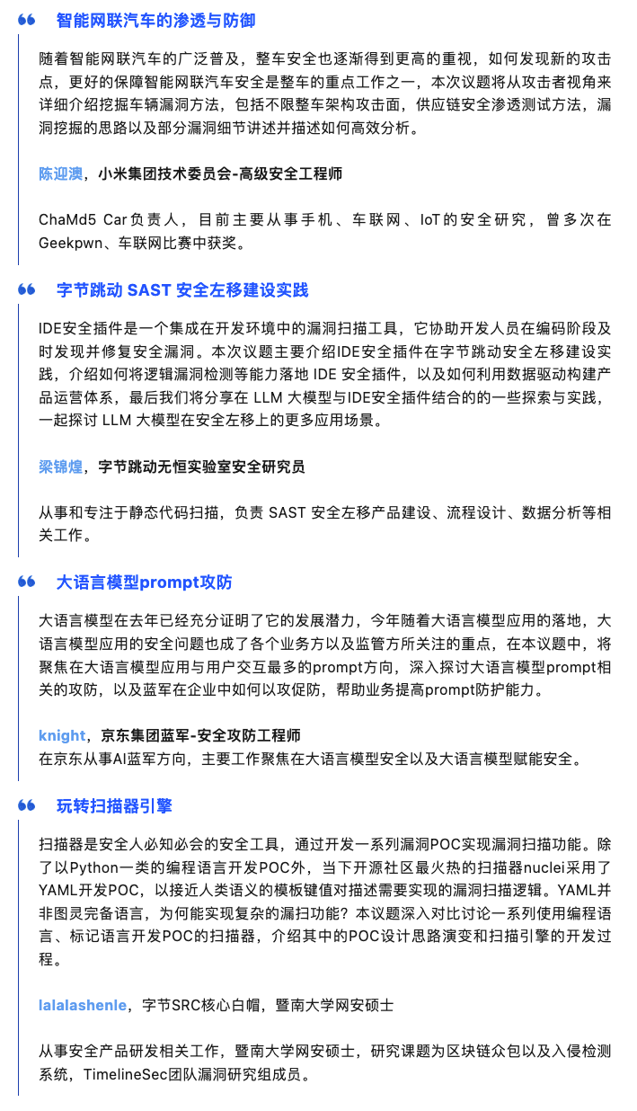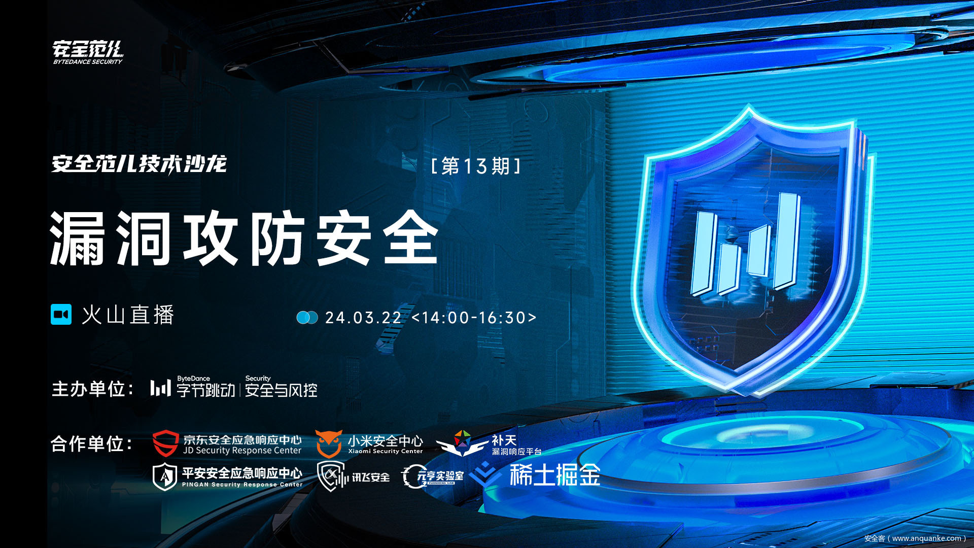 3月22日,安全范儿技术沙龙再度开启,龙年首场沙龙主题再次聚焦「漏洞攻防安全」。来自字节跳动无恒实验室、京东集团蓝军、小米集团智能终端安全实验室、字节SRC核心白帽4位安全专家,将带来安全左移建设实践、大语言模型安全攻防、安全工具、智能网联汽车安全等议题。力求多角度为大家分享漏洞攻防相关的干货技术,助力企业安全水位提升,为白帽师傅挖掘漏洞提供更多思路和方法。