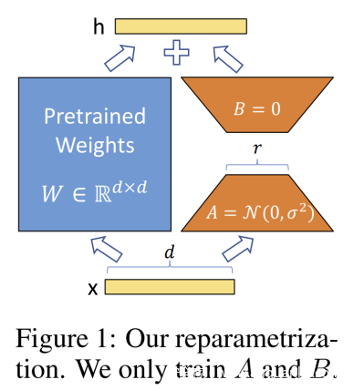 它的底层原理是使用低秩的矩阵变换相乘。图中蓝色部分为预训练权重矩阵,橙色部分为下游任务的训练参数矩阵,矩阵A采用正态分布初始化,矩阵B采用0初始化。矩阵A(d*r)的输入和矩阵B(r*k)的输出和预训练权重矩阵保持一致,分解后的两个小矩阵通过中间变化r来压缩数据。微调训练时只需梯度更新B和A,推理时将BA与原参数合并在一起,不会带来推理延迟。