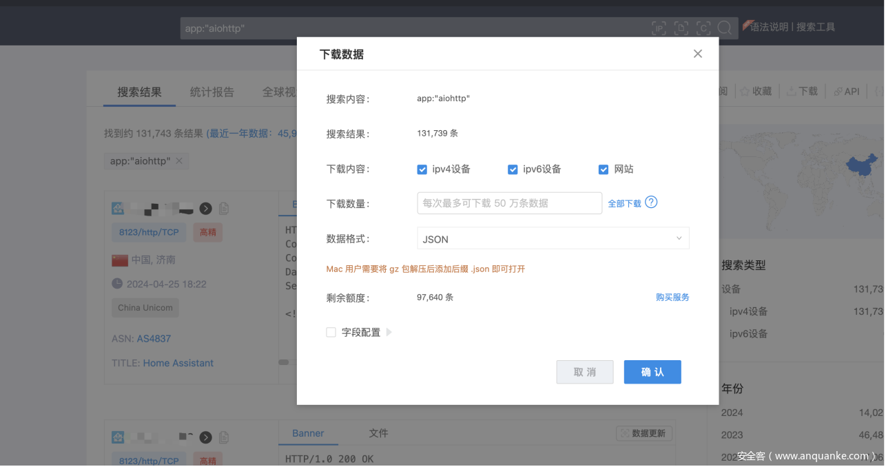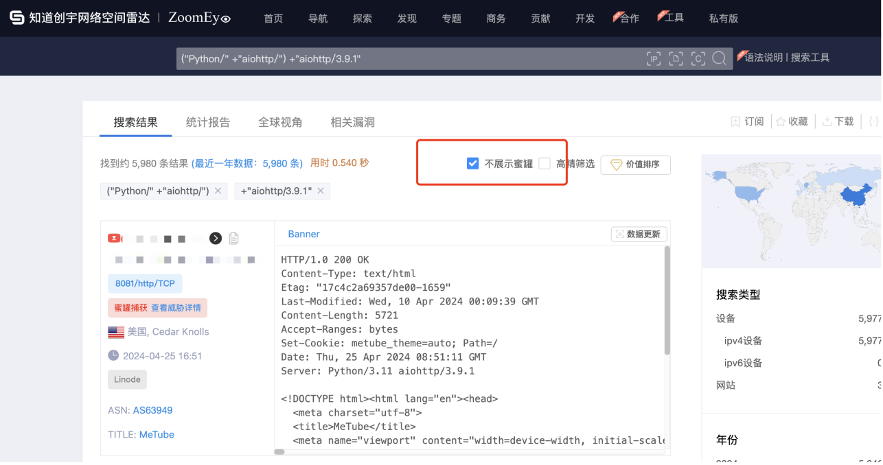 现在使用新的特征”Python/” +”aiohttp/”,也可以使用(“Python/” +”aiohttp/”) +”aiohttp/3.9.1″限定对应版本。ZoomEye 支持蜜罐排除功能,可以勾选此功能,排除蜜罐资产。