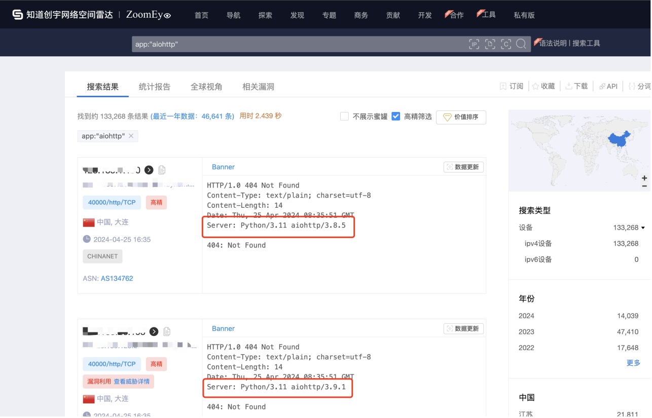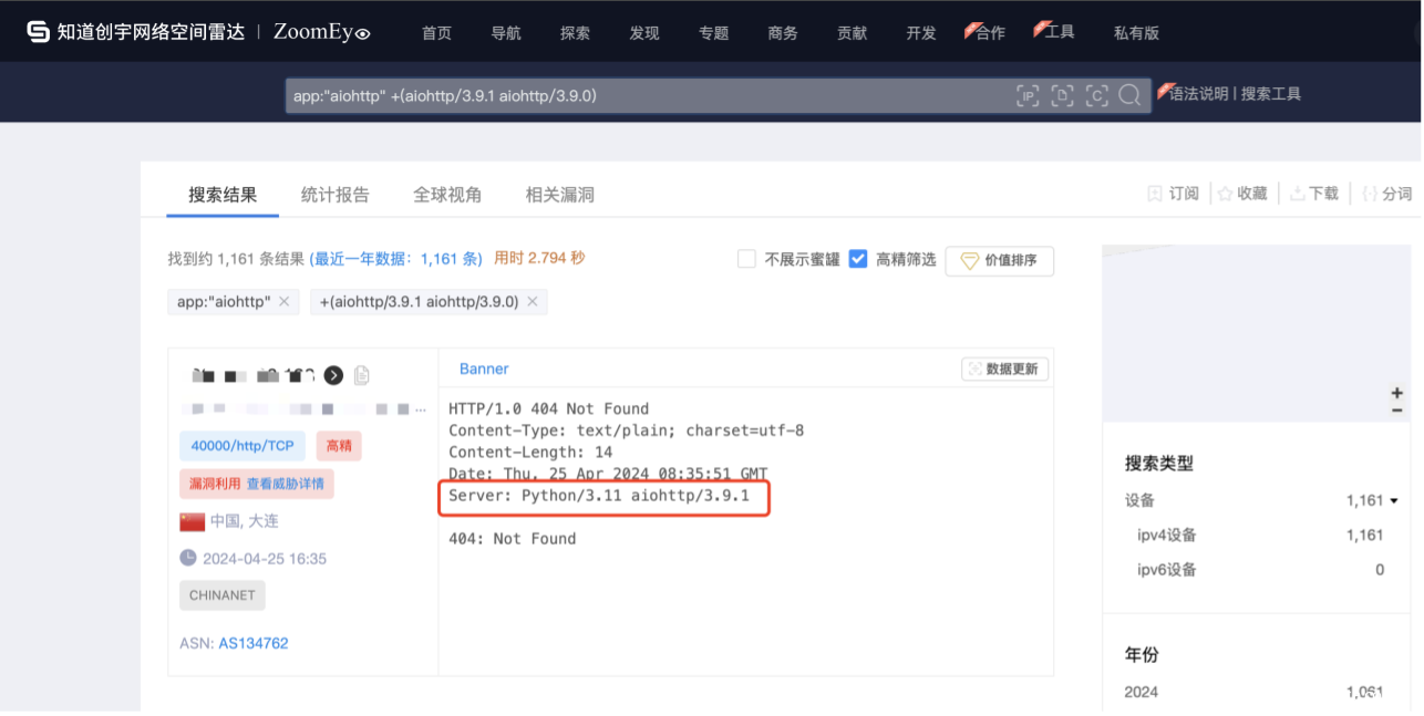 根据前面得到的漏洞信息,CVE-2024-23334 影响 aiohttp 3.9.2 以下版本,因此可以通过 ZoomEye 的语法进行限定,例如想搜索 3.9.1 或 3.9.0 版本的 aiohttp,就可以将语法改为app:”aiohttp” + (aiohttp/3.9.1 aiohttp/3.9.0),在确保组件精准性的同时限定其版本。