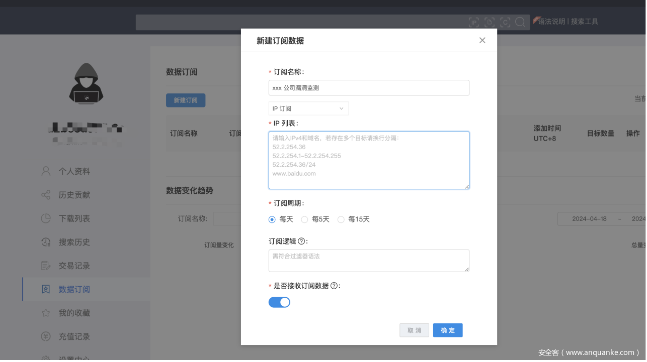 针对漏洞影响资产的变化监测,可以使用 ZoomEye 的数据订阅功能,将资产范围内的 IP 和对应订阅语法填入,创建订阅任务,每出现新的资产就会及时获取,及时管理自身资产攻击面。