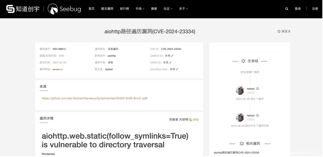 例如,Seebug的漏洞数据库会收录并整理这些漏洞的相关介绍。在 Seebug 的平台上,您可以找到关于 CVE-2024-23334 的详细资料:https://www.seebug.org/vuldb/ssvid-99812。