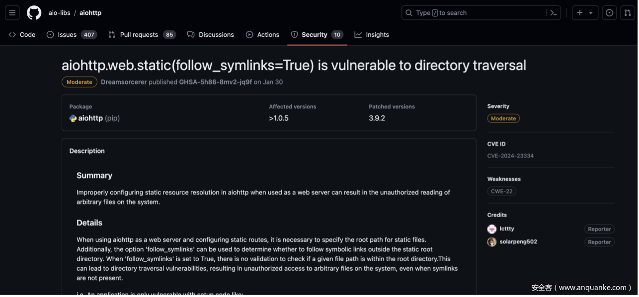 在搜索引擎中搜索 CVE-2024-23334,可以发现其开源仓库地址:https://github.com/aio-libs/aiohttp,便可得知其应用是 aiohttp。