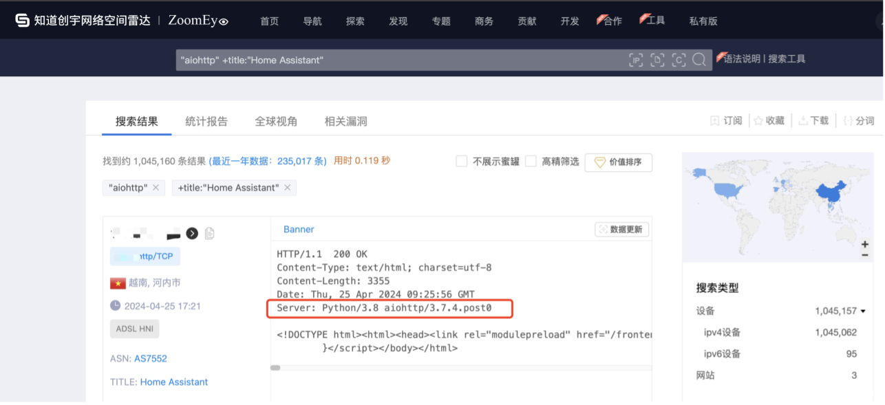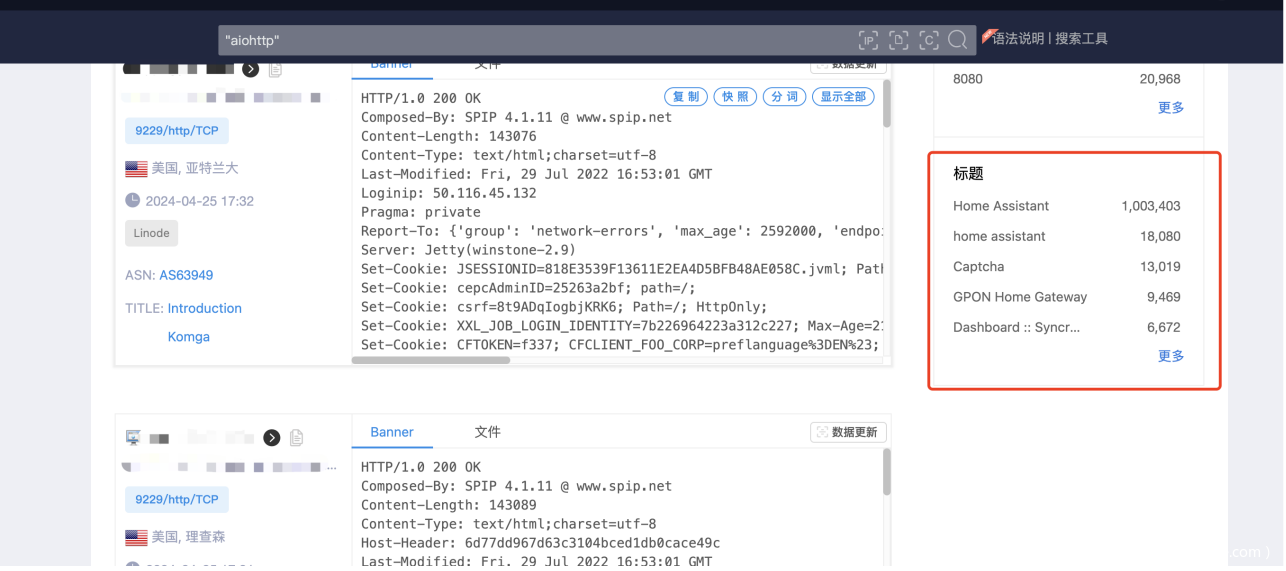 这往往代表一个组件可能就使用了 aiohttp,这是一个通用的思想,搜索其他关键字也是如此。只需要点击右侧标题栏的第一个,ZoomEye 会自动跳转并拼接语法,此时查看 Banner 就可以发现其组件特征。