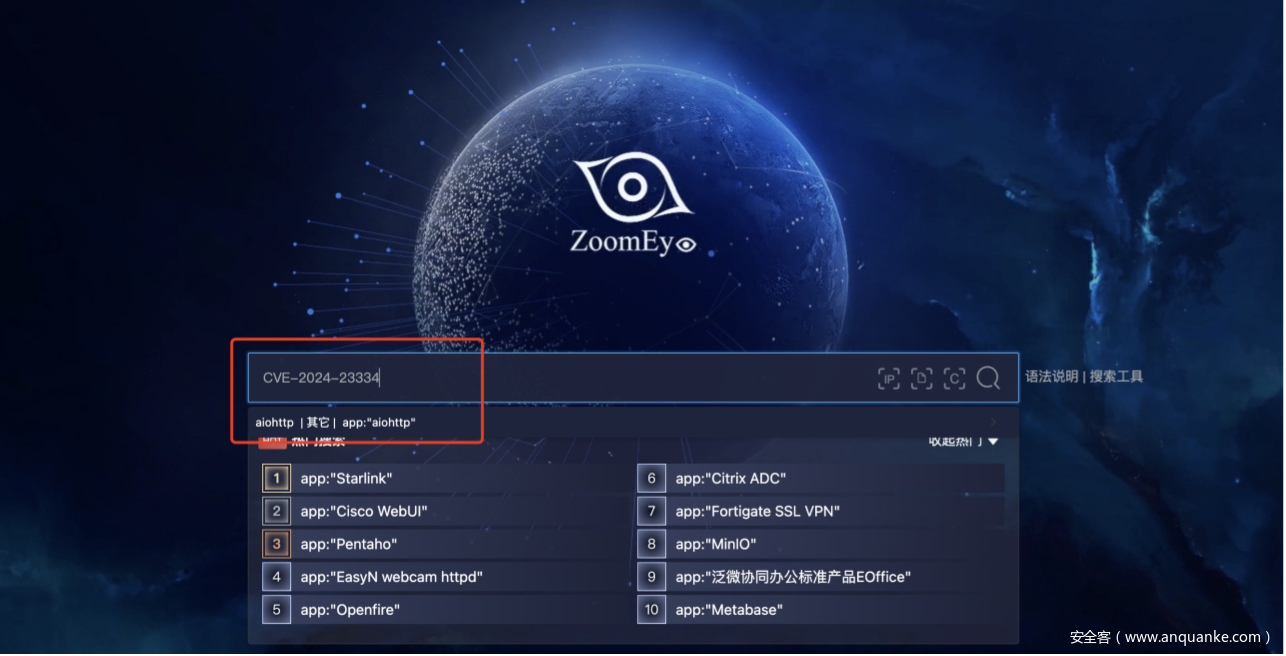 ZoomEye 为了提高用户的搜索效率,提供了一种简便的搜索方式。只需在搜索输入框中输入相应的 CVE 编号,例如 CVE-2024-23334,ZoomEye 就会自动弹出与该编号相关的组件信息。这一功能极大地简化了搜索过程,尤其是对于那些已经知道 CVE 编号但不确定具体影响组件的用户来说。