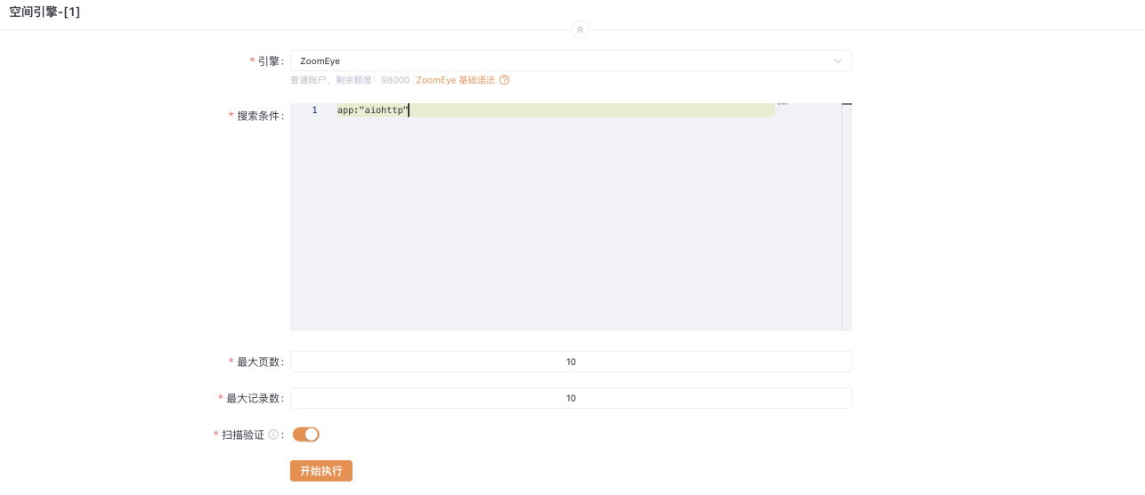 ZoomEye 汇总了非常多的 Web 应用指纹,并精细化筛选汇总,组合成 app 语法。在搜索框输入 aiohttp,ZoomEye 会自动弹出包含 aithttp 的 app 语法。