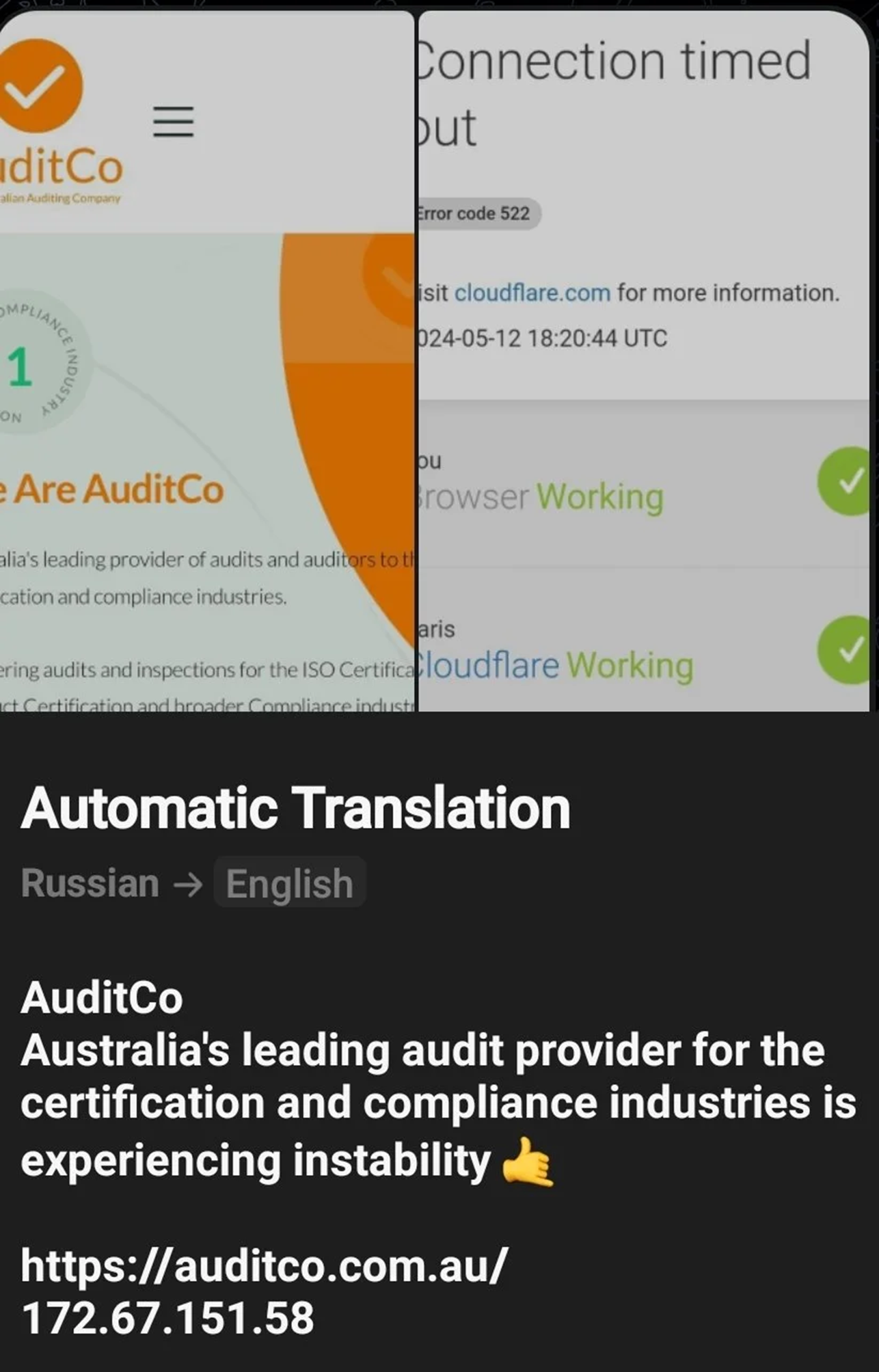 运输服务公司 Wavcabs 和审计公司 Auditco 都是 Cyber Army Russia Reborn 网络攻击的目标之一。 Wavcabs 的在线服务中断,用户在尝试访问该网站时遇到连接超时。同样,Auditco 也面临技术困难,如其网站上之前的错误代码 522 所示。