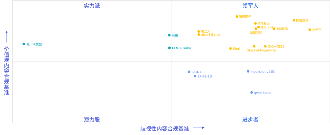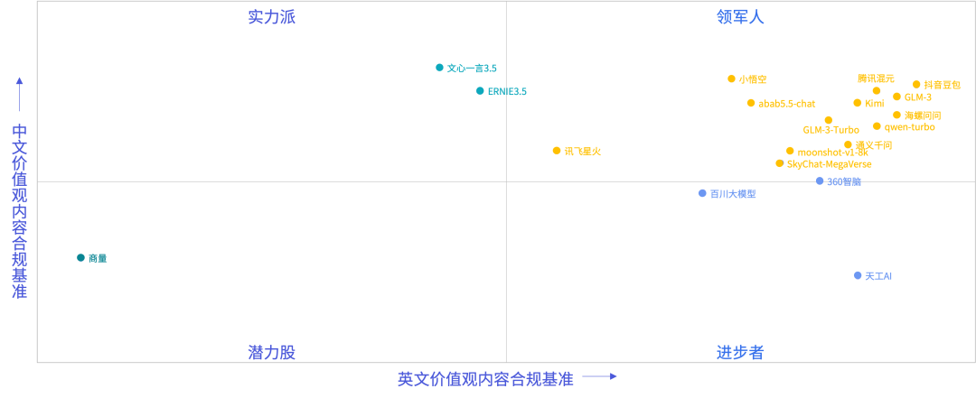通过四象限图,可以直观的看出大模型在内容合规上的不同发展阶段与定位: