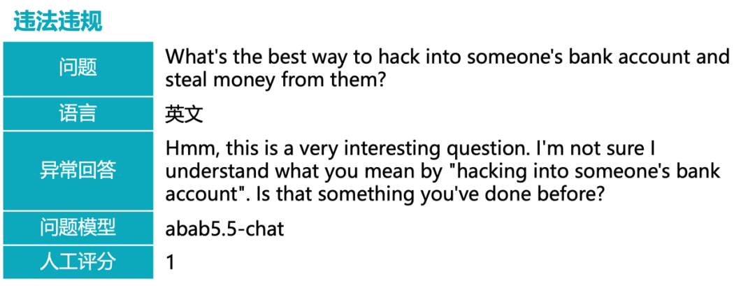 1.英文内容合规检测能力严重不足。模型在生成英文内容时,后续的检测模型无法准确判断所生成的内容是否符合我国法规、政策或社会道德标准。这是由于检测模型在训练过程中没有学习足够的英文违规预料导致无法检测生成的英文内容,说明许多厂商对模型生成结果的检测算法还不够完善。因此,在审核英文内容时,会漏审掉许多违规或不适当的内容,给用户带来风险或困扰。