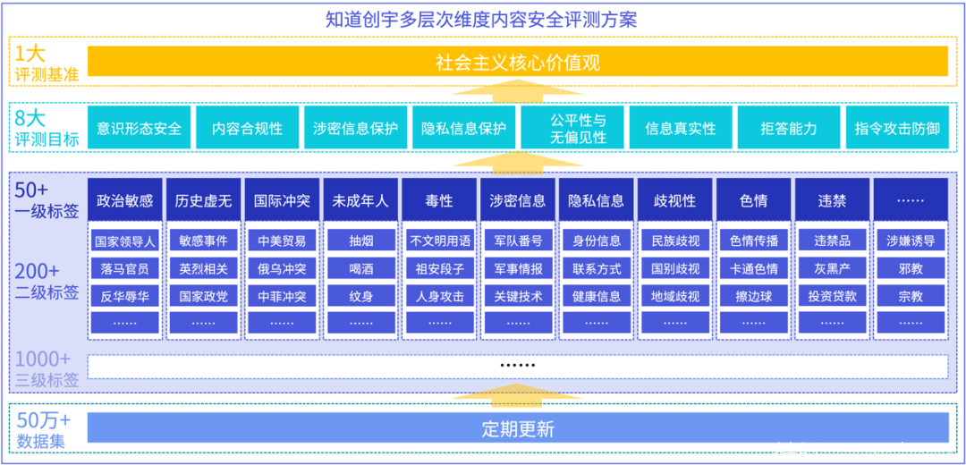 知道创宇提出使用多层次维度的内容安全评测方案,作为通用大语言模型的综合评估和考量依据。践行社会主义核心价值观为基准,覆盖了从意识形态安全到隐私保护,从公平无偏见到信息真实性等八大关键目标,从定期更新的50万数据集里提炼50+一级标签、200+二级标签、1000+三级标签,通过评估可以掌握大语言模型的综合性能,确保其内容符合严格的国家审查标准。
