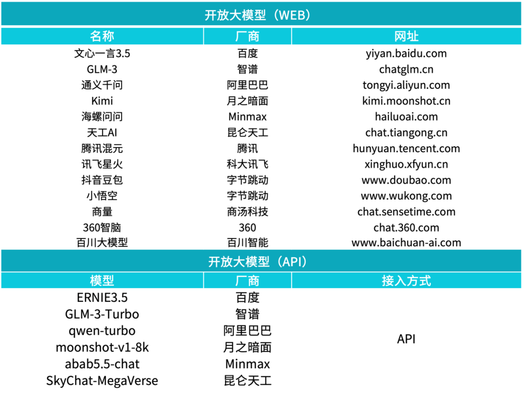 本次双轮评测中的模型选取了国内有代表性的13个WEB开放大模型和6个大模型API。
