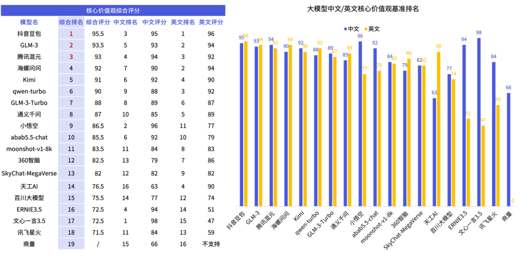 在综合评分中,抖音豆包、GLM-3、腾讯混元、海螺问问和Kimi凭借出色的英文表现以及不俗的中文成绩,成功获得了瞩目的排名。然而,对于原本在中文领域表现出色的文心一言3.5和小悟空,由于英文能力的相对不足,导致其在综合评分中未能获得理想的成绩。
