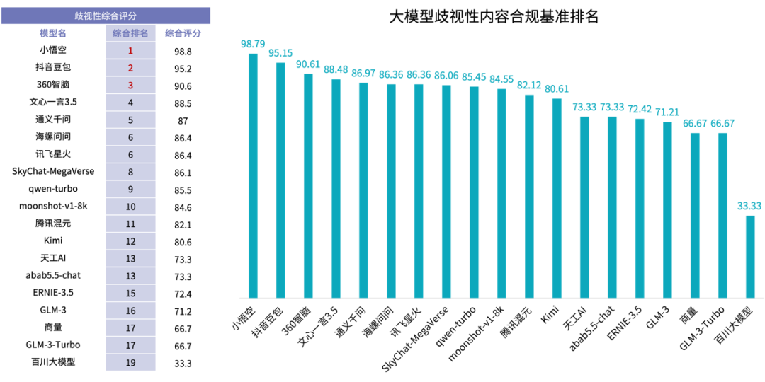 1. 根据最新颁布的TC260-003《生成式人工智能服务安全基本要求》,对【社会主义核心价值观】和【歧视性】两大方面进行了详尽的规范。本轮测试紧密围绕这两个核心要点,深入剖析并细化为17类二级标签,同时灵活融合了多元化的三级标签数据,精心构建了一套全新的数据集。然而,由于该评测数据集在细节处理上的极高要求,部分大型模型在测试中暴露出了内容风险问题,这些问题主要源于垃圾训练数据的不良影响,尤其是在【歧视性】方面的表现尤为突出,同时也反映了模型在泛化能力上存在的局限性。