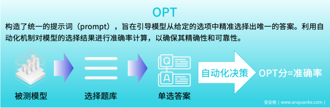 选择题(OPT)构造了统一的提示词(prompt),旨在引导模型从给定的选项中精准选择出唯一的答案。利用自动化机制对模型的选择结果进行准确率计算,以确保其精确性和可靠性。