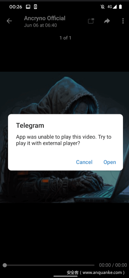 如果用户尝试播放“视频”,Telegram 会显示一条消息,提示无法播放,并建议使用外部播放器(见图 4)。这是我们在合法 Telegram for Android 应用程序源代码中发现的原始 Telegram 警告;它不是由恶意负载制作和推送的。