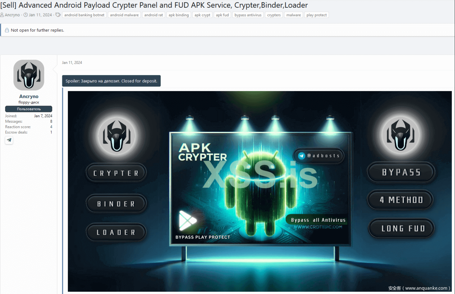 虽然我们对威胁行为者了解不多,但我们根据卖家在论坛帖子中分享的 Telegram 账号找到了他们提供的另一项可疑服务。除了漏洞之外,自 2024 年 1 月 11 日起,他们一直在使用同一个地下论坛来宣传他们声称完全无法检测 (FUD) 的 Android 加密即服务。论坛帖子如图8所示。