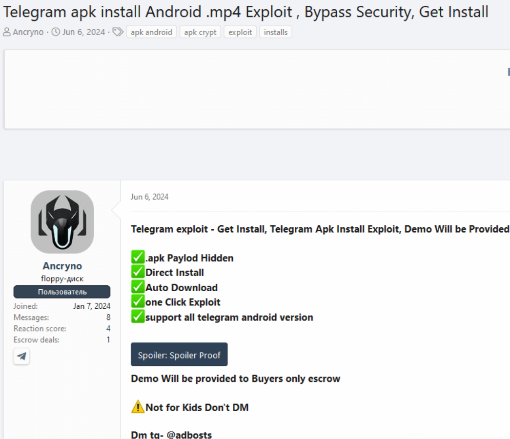 - 2024 年6 月 26 日,我们在一个地下论坛上发现了一个针对 Android 版 Telegram 的零日漏洞广告。