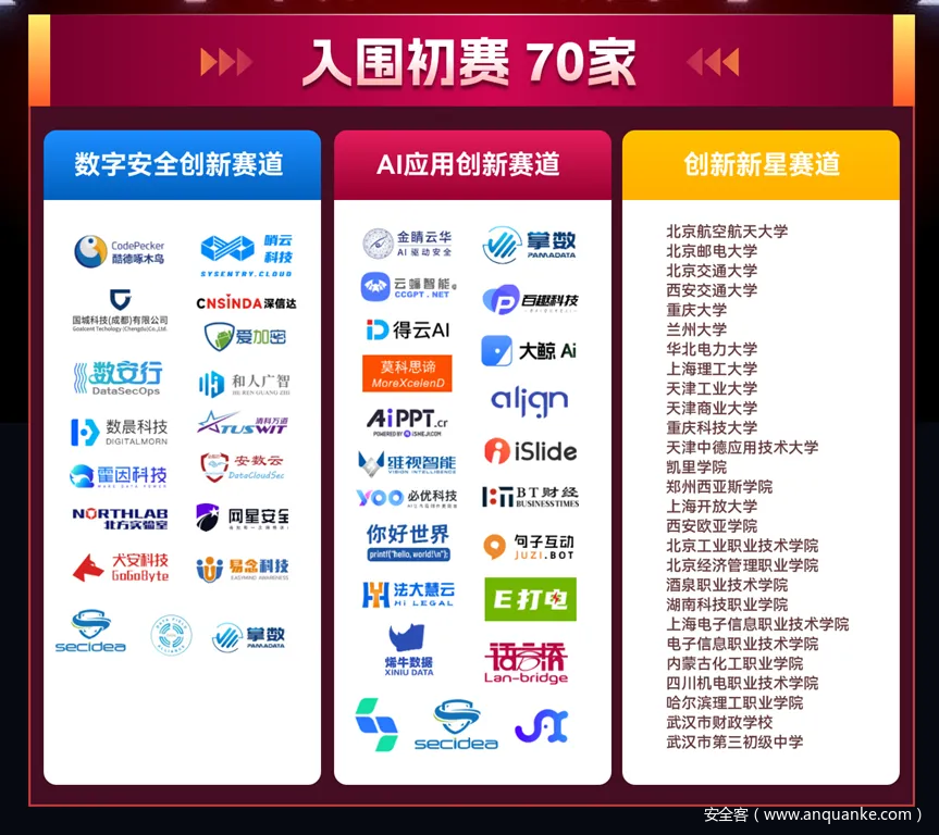 目前,大赛评审团将从技术测评、投资评估、发展解析等层面进行全维度考量评判,以更高视角评估参赛项目的创新形式、实际落地效果、行业推动意义等价值,挖掘出真正能推动数字安全与AI应用创新发展的“明日之星”。在激烈的初赛竞争阶段中,70家创新势力将有30家成功闯入决赛,最终战果,敬请期待!