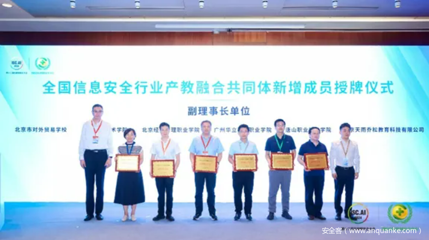 全国信息安全行业产教融合共同体轮值理事长单位代表、北京信息职业技术学院党委书记、院长洪伟在致辞中表示,信息安全技术作为软件和信息服务行业的重要组成部分,关联着国计民生,对接着千行百业,职业教育作为一种教育类型,应该面向信息安全人才需求的主战场,主动适应信息安全人才培养的新形势。行业产教融合共同体是国家战略和区域经济社会发展的重要产教融合载体与平台。新一轮科技革命和产业革命以数字技术、网络安全、人工智能、物联网等领域的突破性进展引发科技和社会领域的变革带来了新质人才培育的挑战。全国信息安全行业产教融合共同体轮值理事长单位代表、360数字安全集团副总裁卜思南在致辞中表示,360作为行业产教融合共同体的牵头单位,将不遗余力地发挥领军企业的引领作用,确保共同体的工作顺利开展、高效地向前推进。同时,期望通过本次大会携手各方合作院校、企业伙伴,一起深入挖掘“安全+AI”的潜力,深化供需对接就业育人、发挥共同体组织平台作用,培养出更多具有创新精神和实战能力的人才,为经济发展注入新的活力和动力。产教融合是教育和产业共生共长,双向赋能。教育部高等学校网络空间安全专业教学指导委员会秘书长封化民在致辞中表示,要培养一批既具有高水平的教学能力,又具有丰富的网络安全实战经验的“双师型”教师,打造一批网络安全教学案例,补齐高校网络安全实践环节的短板,同时让企业深度参与人才培养的过程。大会发布仪式环节中,北京信息职业技术学院党委书记、院长洪伟,360数字安全集团副总裁卜思南为全国信息安全行业产教融合共同体的6所新增副理事长单位代表和8所新增理事单位代表现场授牌。随后,共同体联合北京信息职业技术学院共同发布了“产业与人才供需态势感知系统平台”,该平台旨在解决产业与人才之间的信息不对称问题,通过检测指标、数据采集、人才培养方案优化、智能问答、岗位需求发布等功能,为共同体单位提供实时、全面、精准的人才供需态势感知服务,促进人才培养与市场需求的紧密结合。现场,360数字安全集团发布“实网攻防高质量人才培育计划”,宣布将在全国高校设立20个实战训练营,通过全面的课程体系和实战化的教学环境,同时依托ISC学院丰富的安全社区和生态资源,以及职业岗位培训和认证服务等,培养具备实战能力和专业资质的网络安全精英,解决数字安全实战型人才短缺问题。环节最后,360供需对接就业育人“定向人才培养项目”“就业实习基地项目”“人力资源提升项目”举行了结项仪式,360数字安全集团副总裁卜思南,360集团人力资源高级总监王春明为21所院校现场授牌。抢抓“安全+AI”融合发展机遇打造产教融合人才引擎
