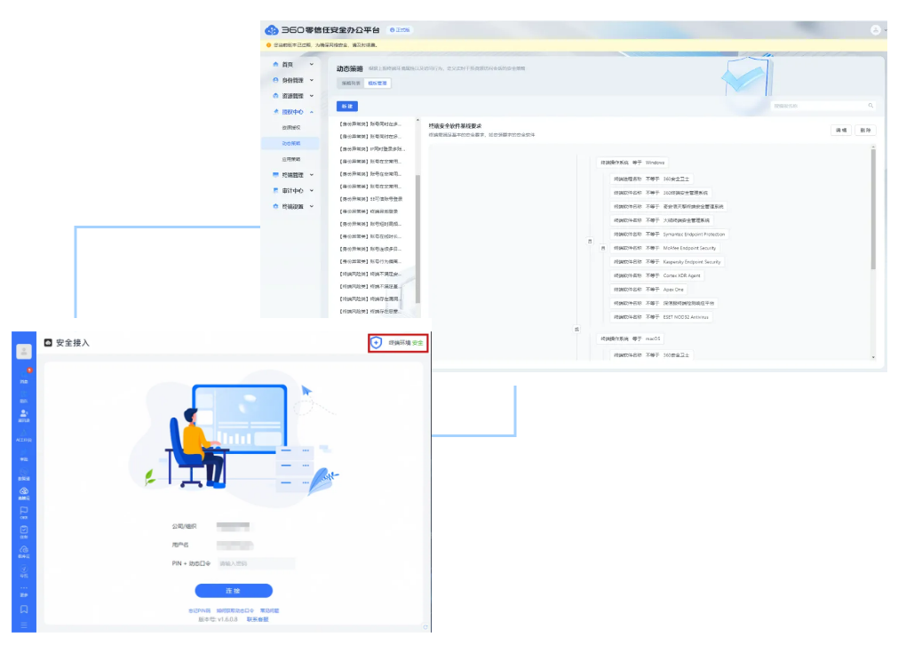 通过在终端安全产品客户端和云端多层面安全数据联动,实时感知终端安全状态,给零信任动态决策提供支撑。同时,结合数据沙箱和应用加固方案,满足BYOD、基线合规、应用安全、数据安全等多样化安全需求。