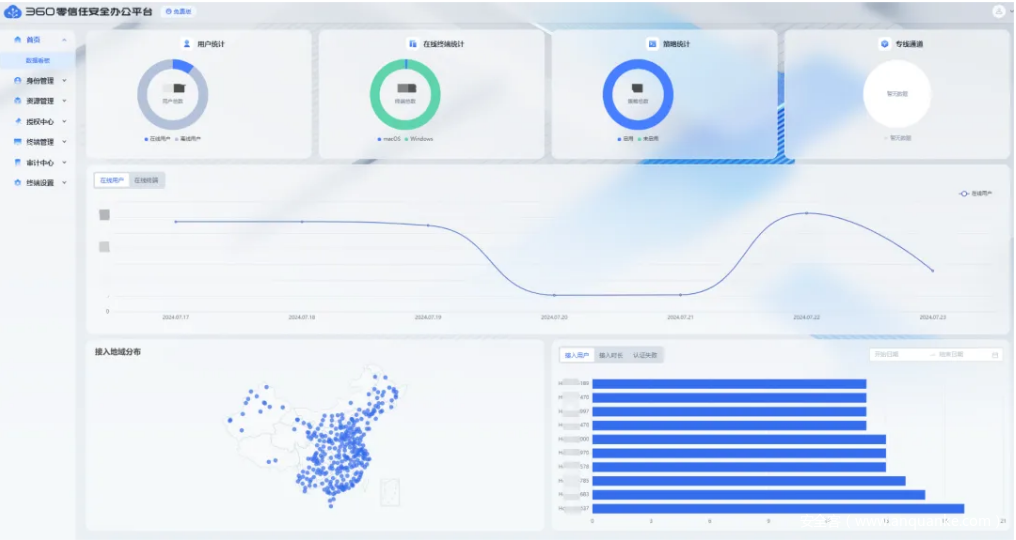 以360自有百余个骨干机房为云基础设施,在全球范围内部署分布式云化零信任网关,为客户就近接入加速网络,提供安全稳定的访问通道,优化业务访问质量。360零信任兼容私有网关混合云部署方式,就近注册接入私有网关、满足敏感业务数据不上云的合规需求。