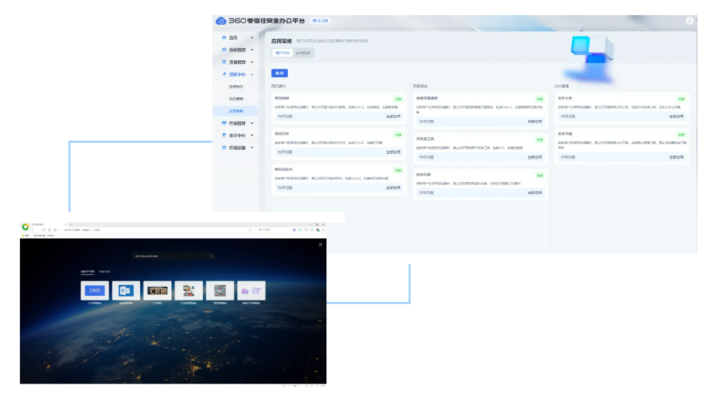 应用层接入模式下,用户仅需登录360企业安全浏览器,即可安全访问已授权门户应用。360企业安全浏览器集成零信任环境感知模块,提供安全感知和数据防护能力,可以有效做到防截屏、反调试、数据不落地。