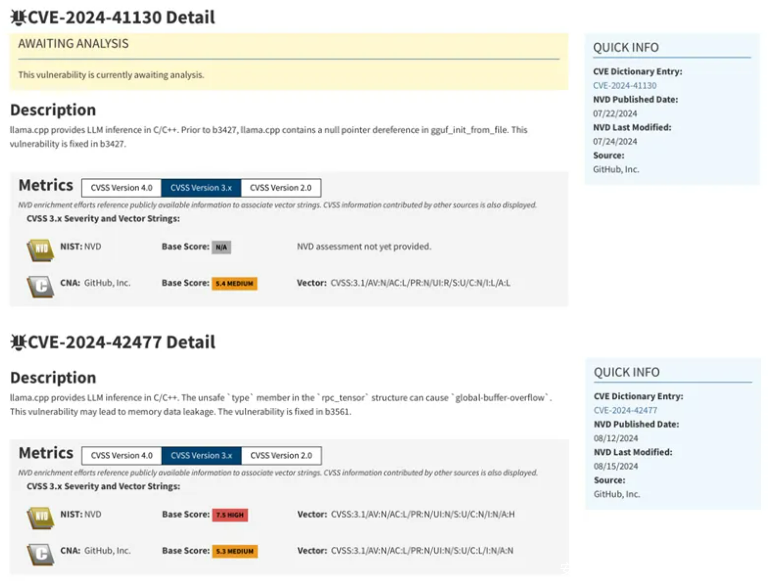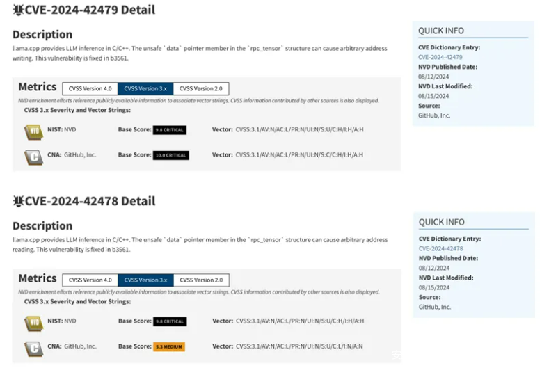 十年前的传统观点认为,人工智能首先会影响体力劳动,然后是认知劳动,也许有一天可以做创造性的工作。然而,伴随人工智能技术的飞速迭进,大模型的应用已经愈发常见。从自然语言处理、图像识别、智能客服到各类业务任务的处理,大模型的强大性能与发展速度已经超乎想象,企业和个人用户都在借助大模型来提高效率、优化决策,甚至推动创新。但比起带给人类的福利,人们似乎更担心大模型将加诸于社会的危害。近日,知名开源大模型开源软件库llama.cpp发布了一系列安全风险预警和软件更新公告,公布了由360漏洞研究院发现的llama.cpp在加载模型和分布式推理场景中存在的多个安全漏洞。其中影响最大的漏洞是CVE-2024-42479, CVSS评分为9.8/10,表明存在较高的利用风险,如若被组合利用可实现远程命令执行。