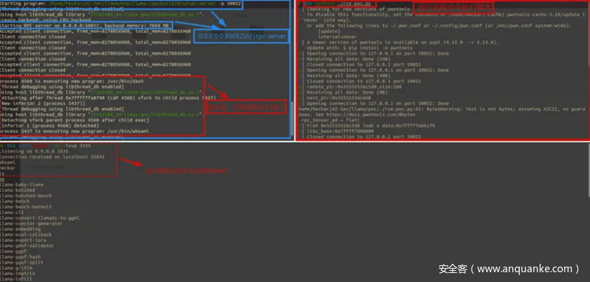 而360漏洞研究院发现RPC-server存在导致未授权远程命令执行的漏洞利用链:首先,该服务是默认使用0.0.0.0来开启,从简单的数字序列就能看出其安全性不言而喻。而在此过程中,其还存在着任意地址写、任意地址读、全局缓冲区溢出3项内存漏洞。攻击者光是使用任意地址写漏洞与任意地址读漏洞组合使用,就能够实现远程命令执行(Remote Command Execute),可以对运行了RPC-server的节点进行攻击,从而控制所有节点。换句话说,一旦llama.cpp在分布式多主机推理的过程中被恶意攻击者利用漏洞进行攻击,攻击者可以在未授权的情况下,实现执行恶意命令、窃取用户敏感数据、窃取AI模型,甚至控制所有推理设备等一系列操作。