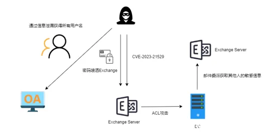 2023年攻防演练期间,攻击者通过OA系统信息泄漏漏洞获得企业所有员工的用户名,随后攻击者把用户名制作成不同格式的用户名字典,对Exchange服务器进行密码喷洒,结果获取一个普通账户的凭据。基于已获得的普通权限凭据,利用CVE-2023-21529漏洞攻击Exchange服务器,获取Exchange服务器的控制权。由于有了Exchange机器对域对象具有WriteDACL权限,所以利用了ACL攻击,获取了域管权限。最后利用邮件委派获取其他人的联系方式等敏感信息。