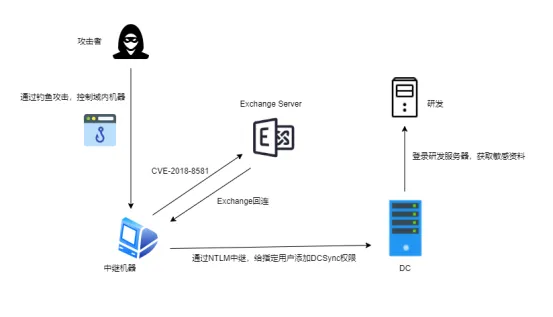 2022年攻防演练期间,攻击者首先通过钓鱼攻击,获得了一台域内终端的控制权。以此为跳板,利用CVE-2018-8581漏洞触发Exchange带上Exchange机器账户的凭据回连跳板机,然后跳板机将此凭据中继到域控的LDAP,给指定用户添加DCSync权限。之后拿着研发的凭据登录登录研发服务器,获取到重要资料。