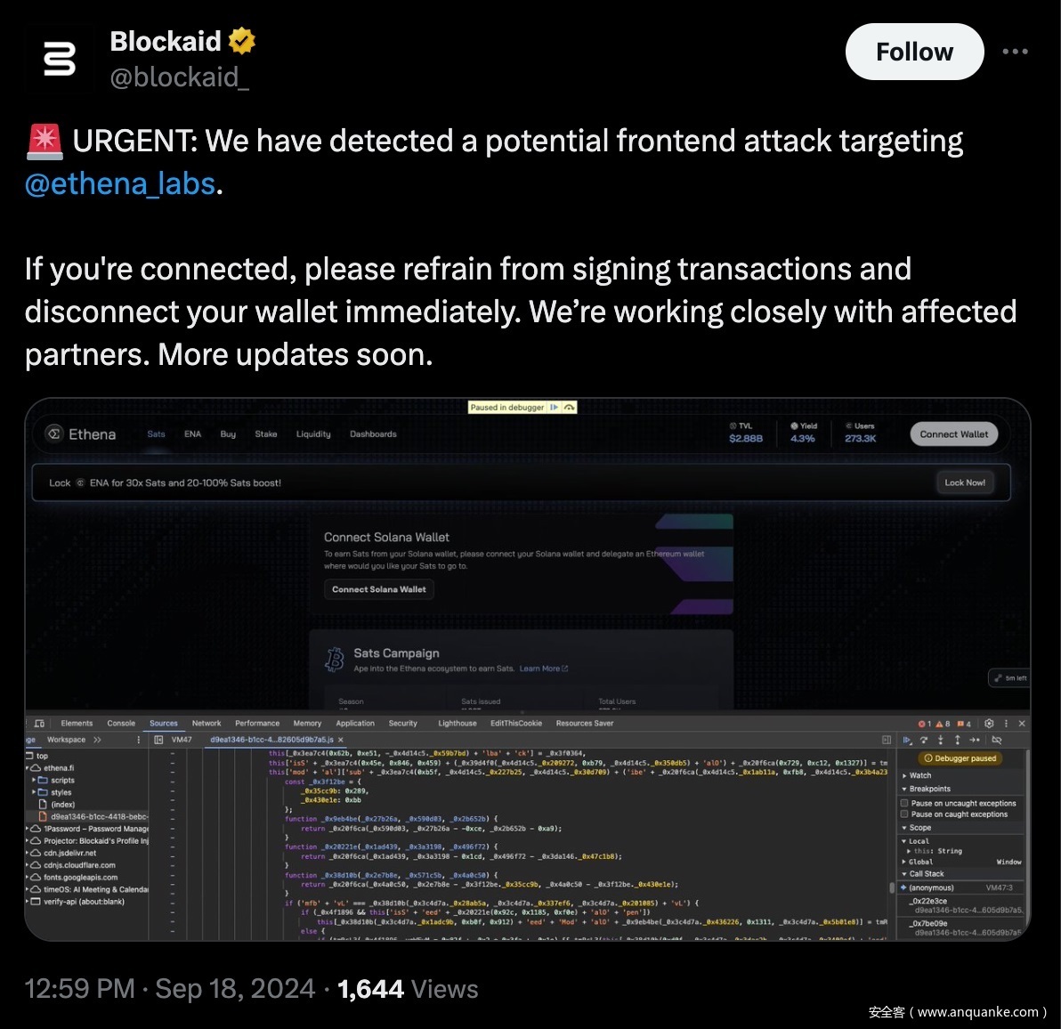 安全公司 Blockaid 还警告在漏洞利用发生时连接到该网站的 Ethena 用户不要签署任何交易并“立即”断开钱包连接。