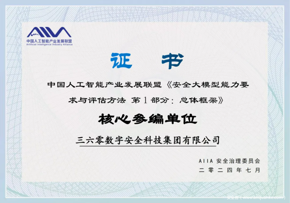 会上,首批“安全大模型基础网络安全能力评估证书”正式颁发,360数字安全集团凭借领先的技术优势和服务能力成功入选,成为首批获证的七家企业之一。同时,360数字安全集团获授中国人工智能产业发展联盟《安全大模型能力要求与评估方法 第1部分:总体框架》核心参编单位。近年来,随着人工智能产业的高速发展,如何利用大模型技术来有效提升网络安全保障水平已成为网络安全领域的热点研究方向。为进一步促进安全大模型的规范化应用,中国信通院依托人工智能产业联盟(AIIA)安全治理委员会,启动了“安全大模型系列标准”的编制工作,360数字安全集团积极参与,承担了核心内容编写工作。