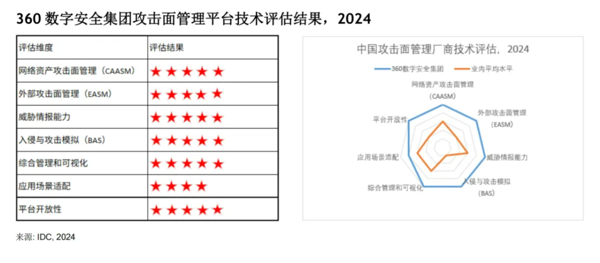 近日,全球领先的IT市场研究和咨询公司IDC发布《IDC Technology Assessment:中国攻击面管理厂商技术评估,2024》报告(Doc#CHC51516424,2024年9月)。360攻击面管理方案入选该报告,并在网络资产攻击面管理(CAASM)、外部攻击面管理(EASM)、威胁情报能力、入侵与攻击模拟(BAS)、综合管理和可视化、平台开放性等六项评估中获得五星满分评价。