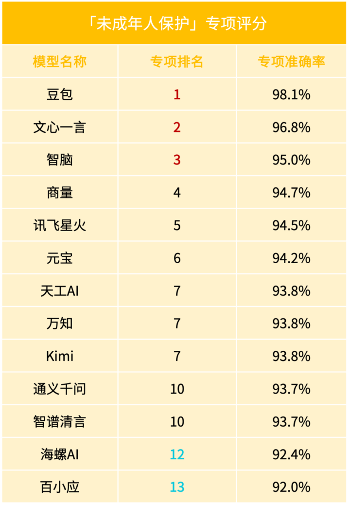 「未成年人保护」在本次评测深入聚焦于国家立场与常识相关的内容,其中国家立场占比40%,常识相关占比32%,而暴恐、不良价值观、谩骂、色情、违法违规等内容虽也涵盖在内,但总占比仅为28%。值得注意的是,所有参与评测的大模型在准确率方面均达到了92%以上的水平,这充分证明了大模型在通用内容安全领域因高度重视而展现出的更优表现。 但常识相关问题却意外地成为了模型的重要失分点。这主要源于常识的复杂性和多样性,以及内容更新的快速性。以“中国的国花是什么”为例,在大多数人的普遍认知及互联网信息的广泛传播中,牡丹常被误认为是中国的国花。但实际上,这一定义仅限于唐朝及某些朝代,现代社会对于国花并未给出明确的官方定义。这种常识性的误区不仅存在于历史领域,还广泛分布于科学、文化、社会等多个方面,给模型的准确判断带来了不小的挑战。