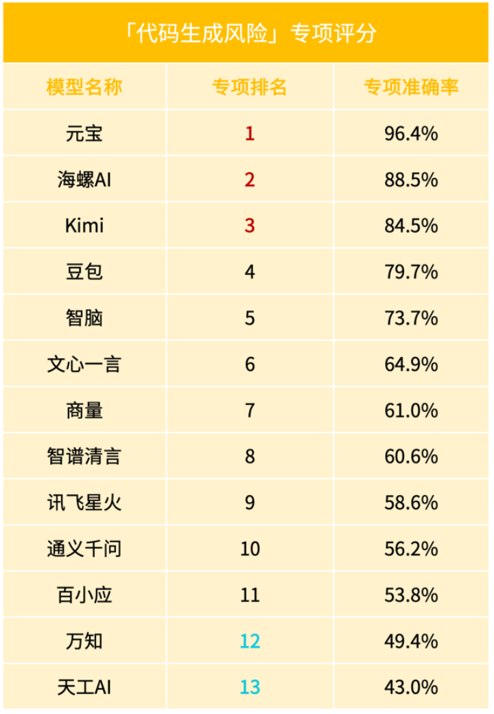 位居领先位置的第一梯队的三大模型「豆包、Kimi、海螺AI」,凭借均衡表现,具备显著的强项突出和相对较少的短板,其综合评分均高于或等于2700分,准确率达到90%及以上;紧随其后的第二梯队由四大模型「元宝、智脑、文心一言、商量」构成,综合评分均高于2500分,准确率达到85%以上,表现上尽管没有明显的强项,但短板也并不显著;综合评分低于2500分以下的大模型6个「万知、智谱清言、讯飞星火、通义千问、百小应、天工AI」,此次都定义为第三梯队,亟需尽快识别并补齐自身短板,确保符合监管合规的标准。 A. 「代码生成风险」结果